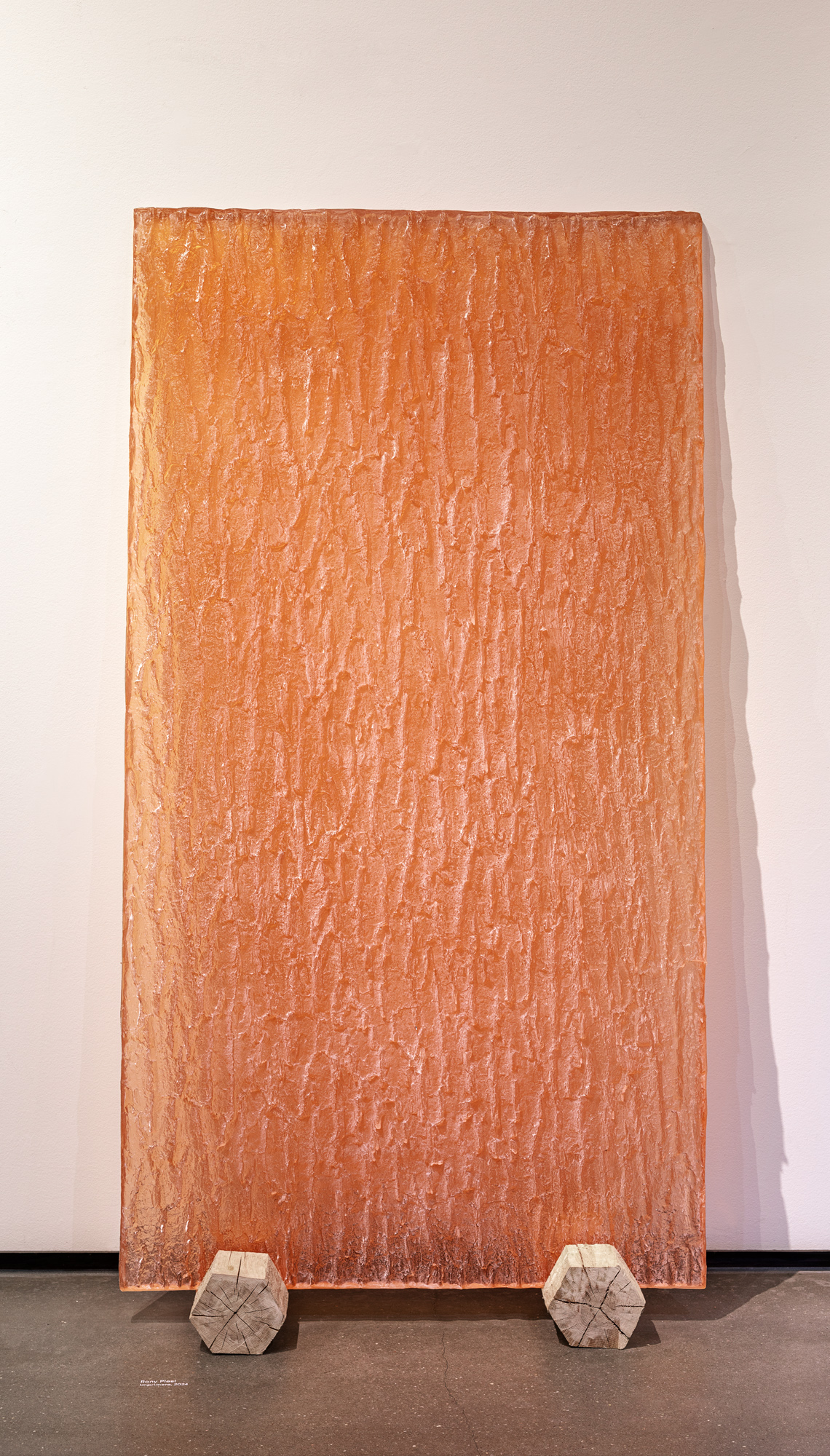 This sheet manifests the endless possibilities of the unique Vitrum Vivum technology – its structure is a true imprint and cast of oak bark in glass – which was introduced at the site-specific installation Trees Grow from the Sky at La Biennale di Venezia 2022. The installation encompassed three monumental life-sized trees from crystal glass, proving that large-sized objects can be cast in glass in one piece and with three-dimensional structure with this technology.