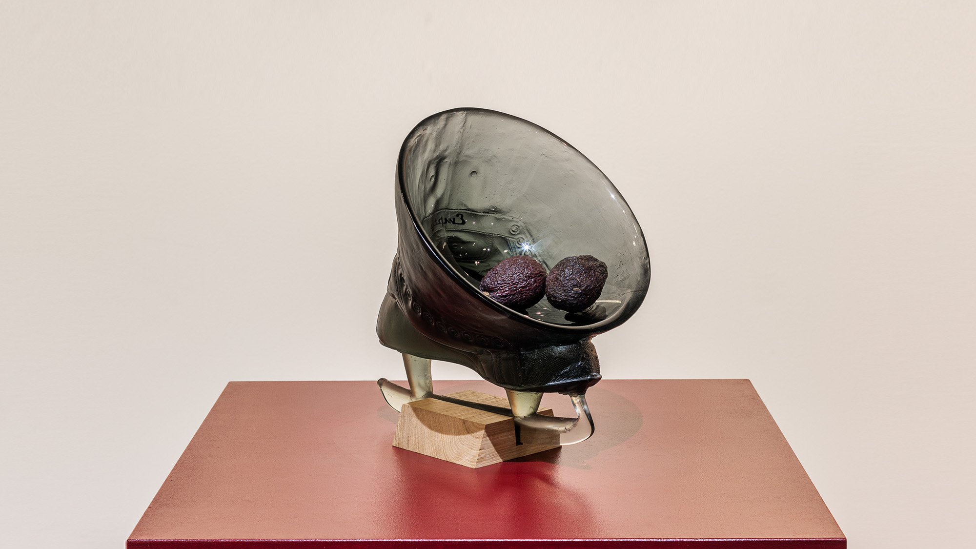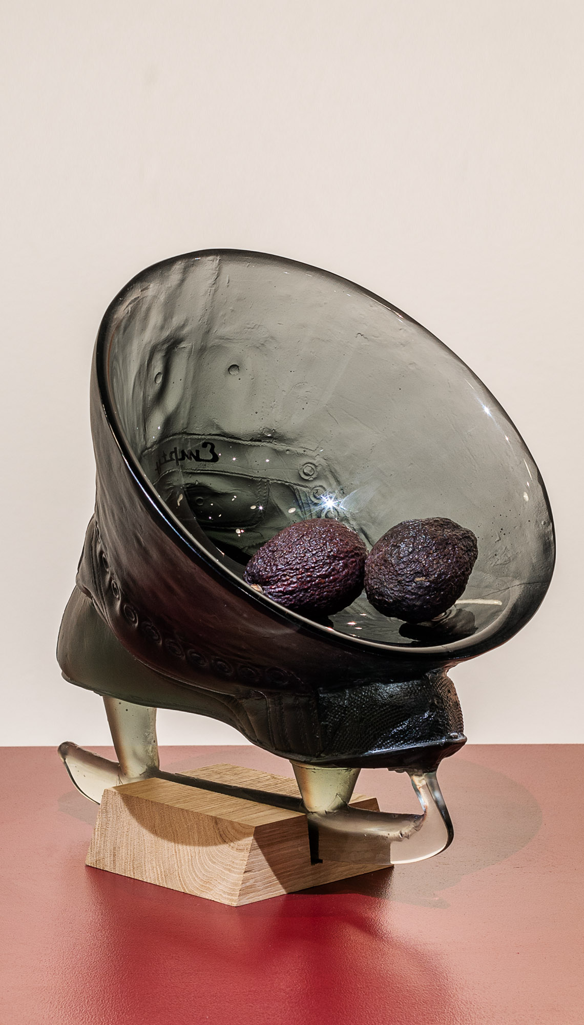 The object depicts a fruit bowl expanding from an ice skate which we tend to tighten to make it firm on the foot. Artist Jiří Černický intensively explores the phenomenon of dynamics in contexts unexpected by the spectators. This dish can thus bring intriguing excitement or even tension into a home usually associated with tranquility and stability. The polished glass blade of the skate aptly captures the instability of the object where must be careful not to cut ourselves. The inscription on the skate alludes to the “emptiness” of sports clubs.